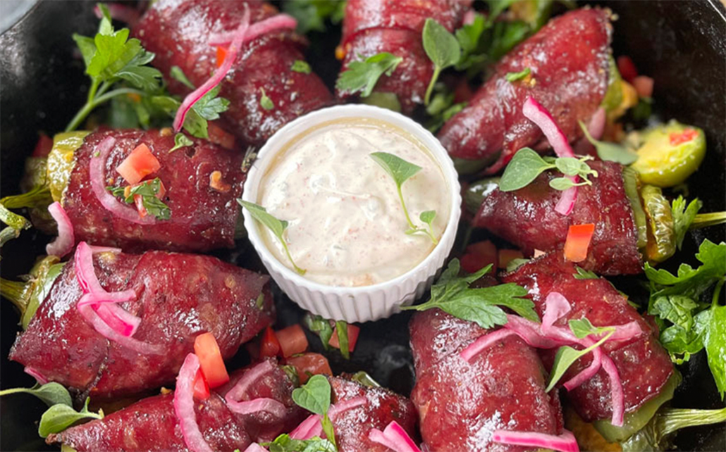 Crispy tots wrapped in smoky bacon, need we say more? Sub in your choice of Godshall’s Beef, Turkey, or Chicken Bacon for this recipe. These salty, crunchy bites are dangerously snackable and practically made for game day. Serve them with your favorite dipping sauce and watch them disappear before the third quarter.